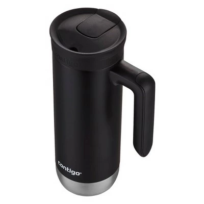 The SnapSeal Insulated Stainless Steel Travel Mug with Handle, 20 oz., keeps drinks hot up to 7 hours or cold up to 18 thanks to THERMALOCK double-wall vacuum insulation. The one-piece SNAPSEAL lid allows for one-handed drinking with no lids or caps to remove or misplace and is leak-proof when closed. Plus, a carrying handle offers more comfort on the go.
