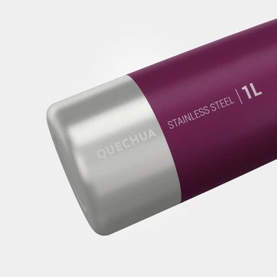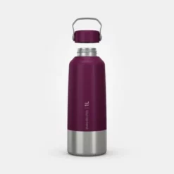 The Quechua MH100 stainless steel screw top hiking water bottle holds 34 ounces total and comes in three color choices: plum, carbon gray, and putty. The stainless steel design makes this water bottle extremely durable and strong enough to withstand bumps and drops that come with hiking outdoors. The screw cap is easily removable and just as easily screws back on with one quick turn.The bottle also features a large carry handle and a wide spout to make refilling the bottle much easier. The stainless steel is food-grade but not isothermal and it doesn’t leave a metal aftertaste. To keep your drink cool, it’s recommended to purchase the 1 L isothermal cover, sold separately.