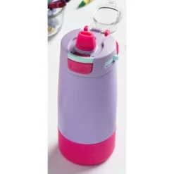 The Ello Colby Pop 12-ounce vacuum insulated stainless steel kids water bottle is built to last. Vacuum insulated stainless steel keeps beverages cold for hours. Colby’s leak-proof locking flip lid features a fully-covered and yuck-free straw that minimizes spills.