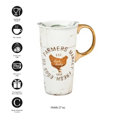 This 17 oz. ceramic travel cup comes with a slide closure Tritan lid and a matching gift box. It has a gold handle. The mug features a farmhouse style wood with a stamp that reads: Farmers Market Fresh Eggs Co. Est. 1950. Chicken icon: laid daily. At Evergreen, we are committed to producing premium, quality products to bring a touch of color and personality to your home. We respect and celebrate the uniqueness in everyone by offering one of the world’s largest selections of home and garden decor.