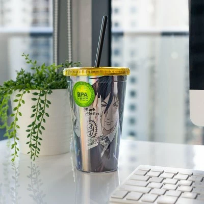 Show off your love of the hit anime Black Butler with this collectible carnival cup! Carnival cup features a shiny metallic foil design depicting the character Sebastian. Featuring quality plastic construction, this carnival cup holds 16 ounces of your favorite beverage. Comes complete with screw down lid and straw. Sure to make a great gift for any Black Butler fan! Officially licensed.
