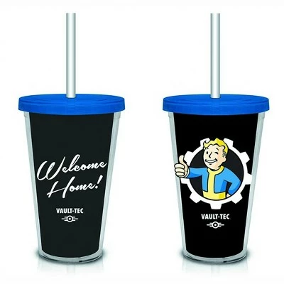 Stay hydrated with some help from Vault-Tec! This officially licensed Fallout travel cup with straw holds 18 ounces of your favorite beverage (including Nuka Cola)! Stylish black cup features the text “Welcome Home” and Vault Boy and the Vault-Tec logo on the other side. Features a secure pop on lid and it even comes with a plastic straw! The perfect gift for vault dwellers, wasteland wanderers and Fallout fans. Not dishwasher or microwave safe. Hand wash only.