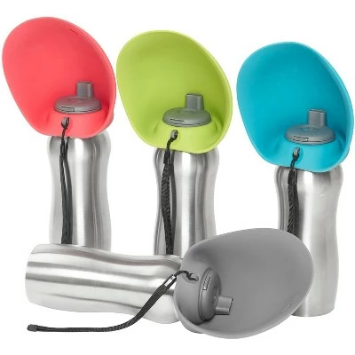 These Messy Mutts travel water bottle and bowl are easy to use and ideal for walks, hikes, and road trips with your pup. The stand out feature of this bottle is the fold-up silicone bowl that emerges to quench your dog’s thirst with a simple press of the quick-release button. Better yet, any unused water drains back into the stainless steel bottle after use, and the bowl folds back over the bottle for easy portability. This bottle is everything you and your pet need to get out and go. Measurements: 3-1/2″ diameter x 9-1/2″ H, with a 24 ounce capacity
