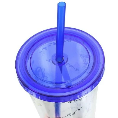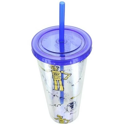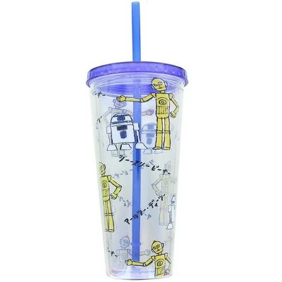 Show off your love of a galaxy far, far away with this fun tumbler! Tumbler features Japanese writing with the droids R2-D2 and C-3PO drawn in a fun, child-like manner. Durable plastic construction with lid. Hand wash only. Not dishwasher safe. Do not microwave.