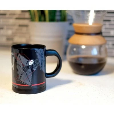 - FUN DESIGN: 12 ounce black mug features the schematic for a TIE Fighter SF.