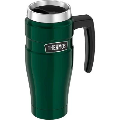 The rough and tumble Thermos 16 oz. Stainless King Insulated Stainless Steel Travel Mug is great for long treks or long road trips, whether to the wilderness or across town. The Stainless King Travel Mug is an extremely durable vacuum insulated mug that holds both hot and cold beverages. It’s a dependable, always-at-the-ready product that can be used all year long, in any kind of condition. Your hot drink stays hot while the mug exterior stays cool and your cold drink will not cause sweating. The sealing DrinkLock lid is leak-proof when closed. The sturdy handle makes holding and transporting easy and comfortable. The vacuum insulation provides maximum temperature retention that keeps drinks hot for up to 7 hours or cold for up to 18 hours. The durable double wall stainless steel makes the exterior stays cool to the touch with hot beverages and sweat-proof with cold. The DrinkLock sealing lid is leak-proof when closed and properly assembled. It also features a built-in tea hook that holds tea bags or most loose leaf infusers. Please Note: The finish of these mugs (matte or glossy) may vary depending on availability.