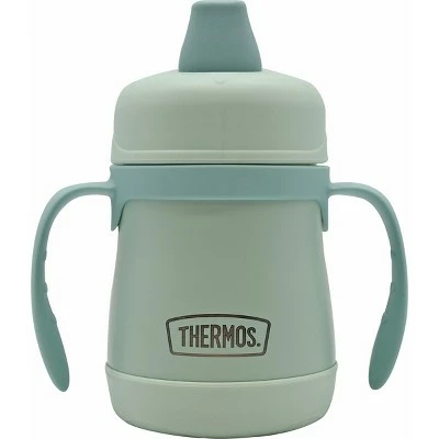 The Thermos Baby 7 oz. Vacuum Insulated Stainless Steel Sippy Cup features handles for your little one to easily grasp while using. The interchangeable lid system allows you to switch out for other lids when your child is ready (sold separately). This sippy cup is crafted with high quality 18/8 stainless steel with vacuum insulation to keep beverages cold. Ideal for ages 6 months and up. Dishwasher safe. Please Note: Not for use with hot liquids.