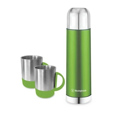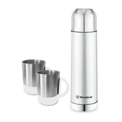 Westinghouse 17 oz Vacuum Bottle includes one drinking bottle and two 7.5 oz Mugs. It has durable Stainless Steel interior and exterior. The Bottle keeps beverages hot for 10 hours and cold beverages for 18 hours.Bottle with leak proof push button lid. This gift set is perfect for any occasion to be used in the house or to take out plus it has the mugs to share!