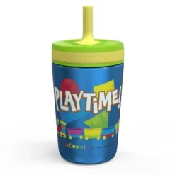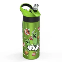 The water bottle holds 14 ounces and is made of food-grade stainless steel, durable enough for kids to take anywhere they want. It’s vacuum insulated, so cold drinks stay cold for longer and condensation won’t form on the outside of the bottle. The screw-on lid has a built-in carrying loop for easy transportation, and doesnt leak when its closed, so the bottle can be tossed into a bag for worry-free travel. When its not being used, the comfortable silicone spout can be covered to keep it clean, with a button that easily opens it and a lock to keep it shut. The bottle should be washed by hand to preserve the vacuum seal and keep the artwork bold and bright, though the lid can be washed in the top rack of the dishwasher. Do not microwave.