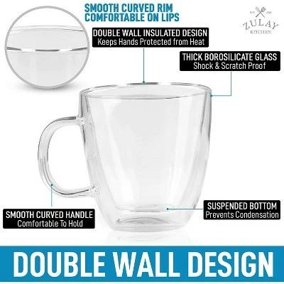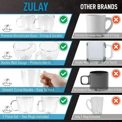 These double-wall thermo mugs are durable and stylish. Made from borosilicate glass, they are less likely to crack and are more resistant to temperature changes than regular types of glass. Specifically designed to suspend drinks in its inner wall for a magnificent look. Have a coaster-free drink with this mug that offers good insulation for any beverage. This 2 mug set can hold a double shot espresso drink. Its capacity is 5.4oz so you can add other ingredients. Glass remains cool-to-the-touch and helps keep hot drinks stay warm longer. It also prevents condensation on the outer surface when drinking a cold beverage. Now you can drink your hot liquid with ease. Can also be used as cappuccino cups, lungo cups, macchiato, latte, demitasse cups, and more. This material is resilient to scratches and doesn’t absorb other tastes or scents of other liquids. These are anti-acid corrosion so you can safely use them with different drinks like tea, smoothie, carbonic acid, fruit acid like juices. Dishwasher friendly. Not only are they functional but these mugs are perfect additions to your kitchen, café, or restaurant. The perfect cup for cold or sunny weather! Enjoy it however you like. These ultra-light mugs are the perfect gift for all coffee lovers in your life. Double Wall Design – Smooth Curved Rim Comfortable on Lips, Double Wall Insulated Design – Keeps Hands Protected From Heat, Thick Borosilicate Glass – Shock & Scratch Proof, Suspended Bottom – Prevents Condensation, Smooth Curved Handle – Comfortable To Hold. 5 oz Capacity (3″x3.25″) – Double-Wall Insulated, Heat Resistant Surface, Scratch Proof, Suspended Bottom. Durable Borosilicate Glass – Shock proof & Scratch Proof, Suspended Base – Prevents Steam & Condensation, Thick Double-Wall Design – Keeps Hands Protected. Smooth Curved handle – Comfortable To Grip. Multipurpose – Espresso, Cappuccino, Latte, Tea, Macchiato, Americano. Insulates Hot & Cold Drinks. Hot – Prevent Condensation, Protects Countertops, Keeps Hands Protected. Cold – Prevent Condensation, Protects Countertops, Keeps Hands Protected. Zulay – Premium Borosilicate Glass – Strong & Durable, Double Wall Design – Protects Hands, Smooth Curve Handle – Easy To Hold. 2 Piece Set – Two Mugs Included. Other Brands – Common Porcelain Mug – Weak & Cheap. Single Wall Design – Hot To Touch. Rectangular Handle – Uncomfortable To Hold, Only 1 Mug Included.