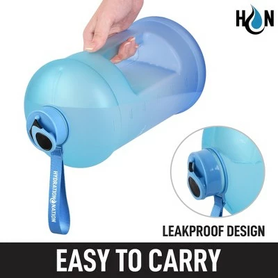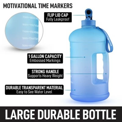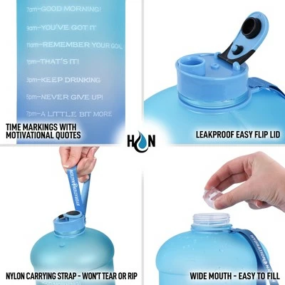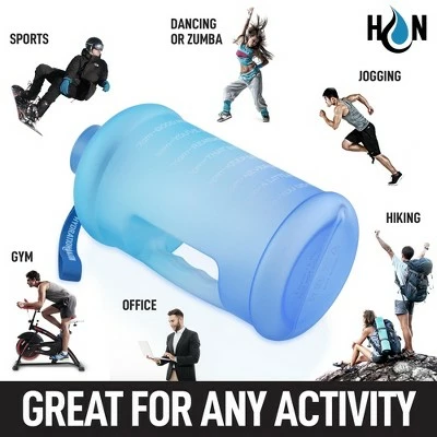 Staying hydrated can be crucial especially if you’re the type of person whose day is occupied with a lot of work and other activities. Our Hydration Nation 1 Gallon Water Bottle will be your best friend, life coach, and personal hydration trainer. It will push you to reach your drinking goals throughout the day. Package comes with an ergonomic nonslip strap. Let’s call it a super water bottle since it will definitely help to hydrate your day! Constructed with BPA Free premium quality material that is transparent, lightweight, and durable. The large 1-gallon capacity is perfect for daily water intake and enough for you to not worry about running out. Plus it will save you money from buying disposable water bottles and reduce waste. The motivational quotes and time markings push you to be competitive and goal-oriented, which makes drinking a gallon of water much easier and fun. Embossed with milliliter (ml) markings for very accurate liquid measurements. Ergonomically designed with a wide mouth for an easy water refill along with a wave patterned handle for a much better and comfortable grip, talk about convenience! Equipped with a flip lid that is leak-proof, making sure your water bottle will not spill and is safe to carry around wherever you go. We have the utmost confidence in our 1 Gallon Water Bottle and we back this up with a 5-year warranty. We ensure that this product will last but if there are ever any issues, just contact us and we will make it right. Order today and we will make your day! If it does not, we got you covered. Chances are, you will never need to reach out!Large Durable Bottle – Motivational Time Markers, Flip Lid Cap Fully Leakproof, 1 Gallon Capacity Embossed Markings, Strong Handle Supports Heavy Weight, Durable Transparent Material Easy To See Water Level. 1 Gallon Capacity – Product Dimensions: DIA: 6.3″x 13″, BPA Free, Leakproof Lid, Anti-Slip Handles, 1 Gallon Capacity. Time Markings With Motivational Quotes, Leakproof Easy Flip Lid, Nylon Carrying Strap – Won’t Tear Or Rip, Wide Mouth Easy To Fill. Great For Any Activity – Sports, Dancing Or Zumba, Jogging, Hiking, Office, Gym. Easy To Carry – Leakproof Design. Hydration Nation – Durable Quality Material, Time Markings – Motivates Your Water Intake, Leakproof Easy Flip Lid – Prevents Drips, 1 Gallon Capacity – Stores More Water. Other Brands – Cheap Quality Material, No Time Markings, Poor Design – Leaks & Spills, 14oz – 128oz Capacity Only.